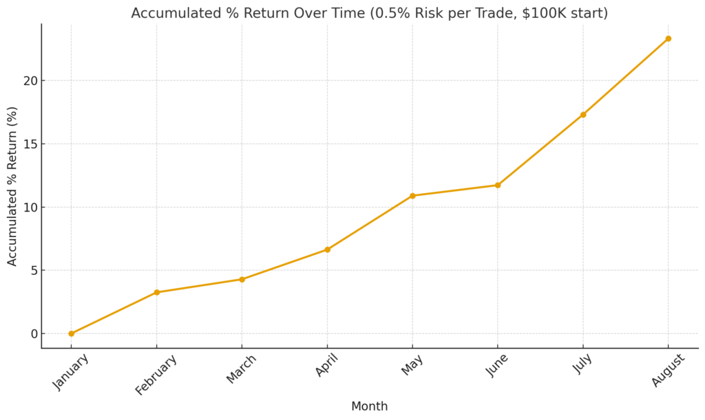 The strategy shows solid results, with close to 50R over a 6-month period. There were no negative months, with the weakest being June (+1.5R) and the strongest August (+10.25R, up to the 20th). Of course, these are backtested results; the same performance cannot be guaranteed in live market conditions where execution speed, psychology, and real risk-taking come into play.
